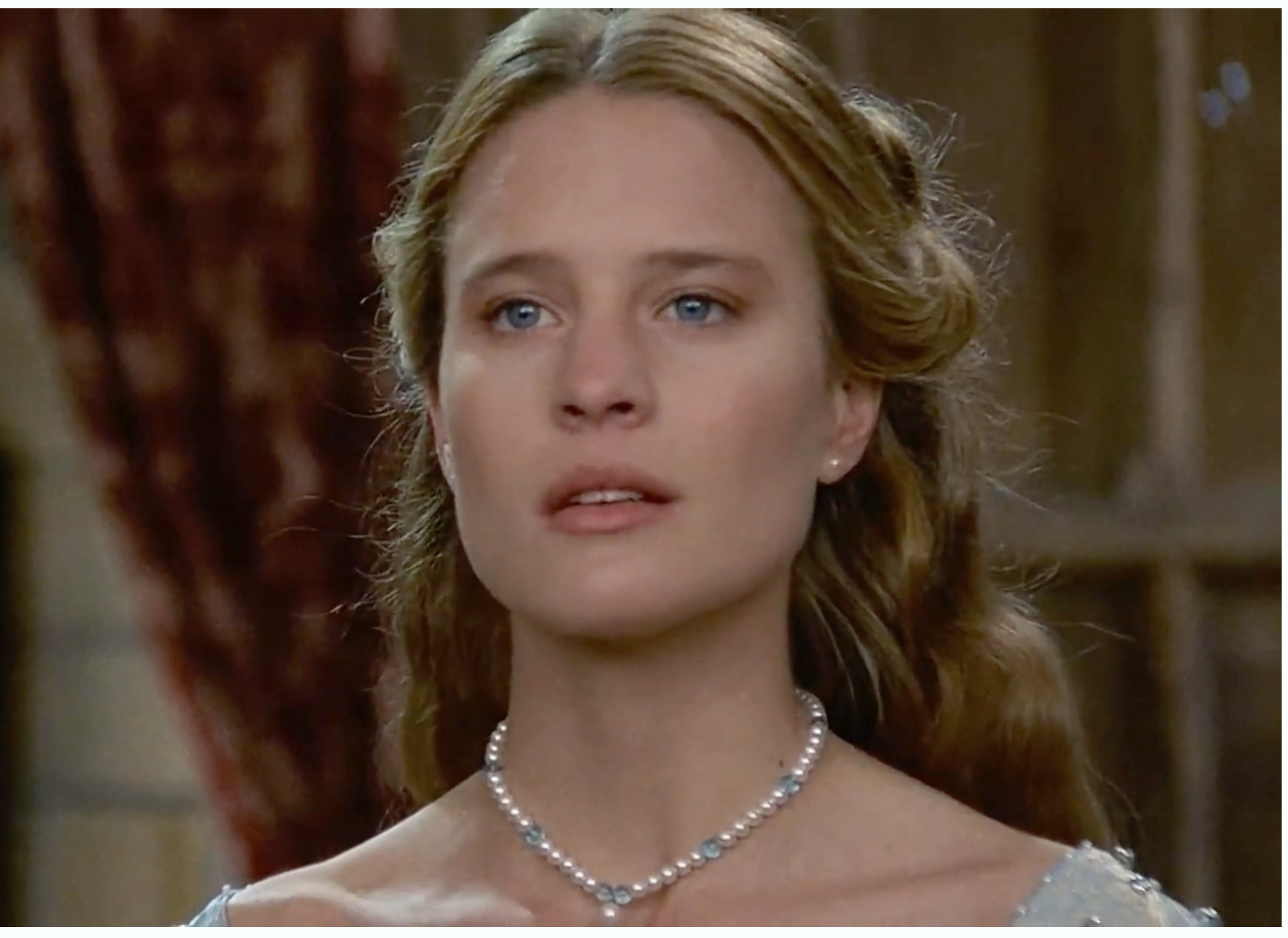 Drew Barrymore wearing a lovely light blue jacquard gown in the 1998 Cinderella reimagining, “Ever After.”