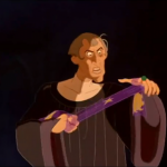 It’s an odd Disney Villain song as Frollo isn’t revealing in his evilness or what his brilliant evil plans are, he is simply singing out his desperation which ultimately gets worse. Unlike other songs, Frollo is not singing to anyone, usually a villain is rubbing something in the hero’s face, being a demagogue, or exposing their master plan of evil to minions. Frollo is singing to himself. It reminds me of La Monture. In the original staging in Notre Dame de Paris, where Fleur de Lys (Phoebus’ fiancee) is singing about her desperation for Esmeralda to be hanged. In the original staging, she singing to her shadow. In singing alone Frollo’s feelings come off more intense, power, and frantic while he sings to the fireplace while seeing illusions and the becomes engulfed in specters.