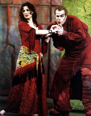 In Notre Dame de Paris Esmeralda wears green but there is one red dress that was wore for advertising for the London cast and the 2001 French cast. This dress is only wore once on stage in the Russian version during her meeting with Phoebus. And even in the 2010/2011 concerts Helene Segara wore red to sing the musical.
