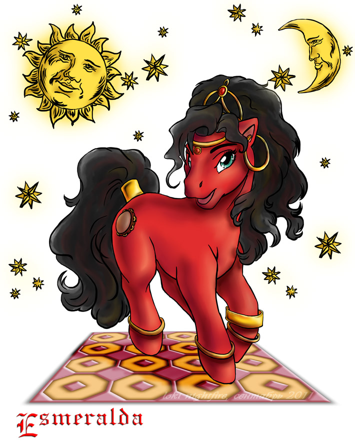 Today’s fan art is by ~Loki-Nightfire. It’s a rendering of Esmeralda as a My Little Pony. I like that the red dress is used as a reference it’s so pretty.