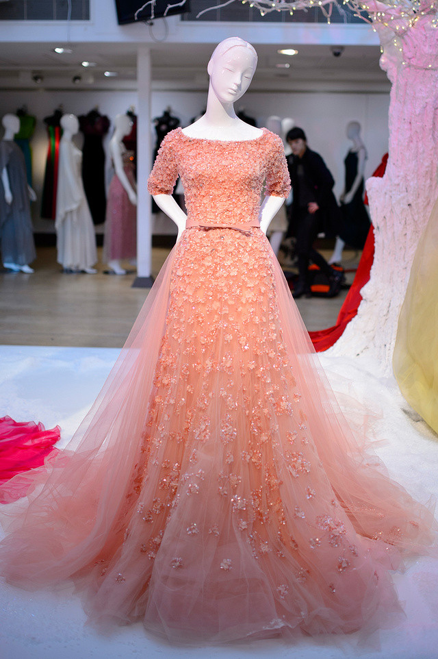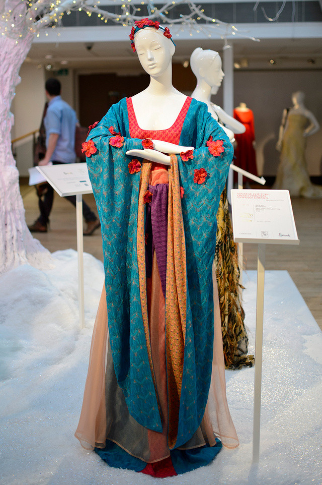 Mulan’s gown is by Missoni. Missoni is all about prints and it seems that like they just remade Mulan’s with their prints. I really like the blue print and the beige chiffon. The applique flowers are a bit much but I think the overall look is a bit much and looks costume-y. 4/10
