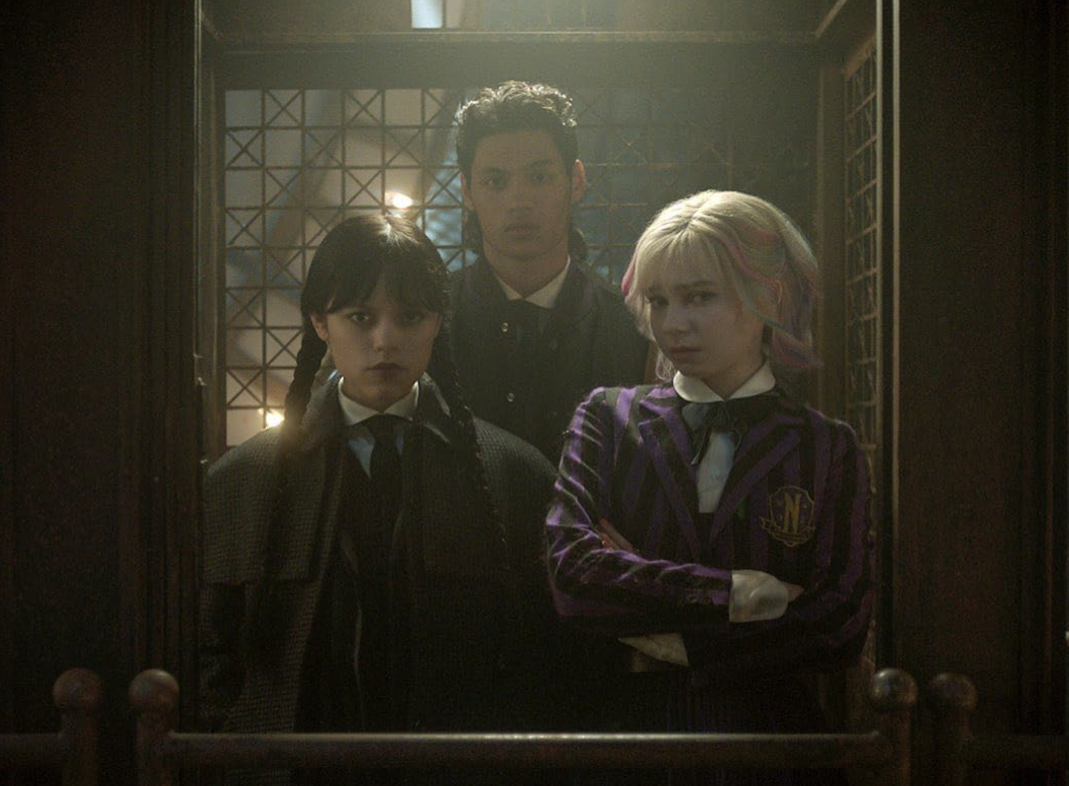Noah Taylor as Bruno Yuson, Jenna Ortega as Wednesday Addams & Emma Myers as Enid Sinclair (Netflix Series Season 2 2025, Season 2, Episode 2)