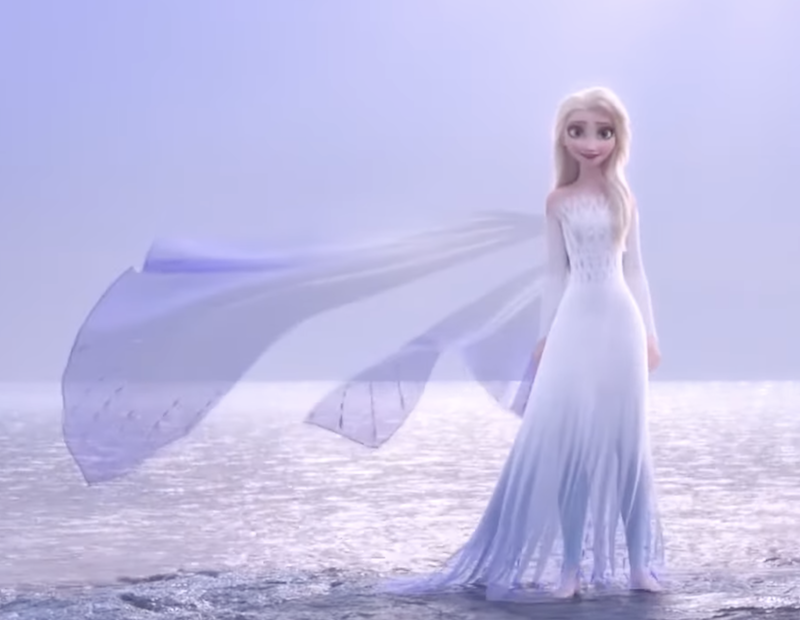 Frozen 2 has a weird plot but it goes hard on the costumes. They are all beautifully detailed and intricate. At the end of the movie Elsa takes her place as The 5th Spirit in this diaphanous yet still icy outfit. Not crazy about the leggings but the upper part is lovely and very graceful.