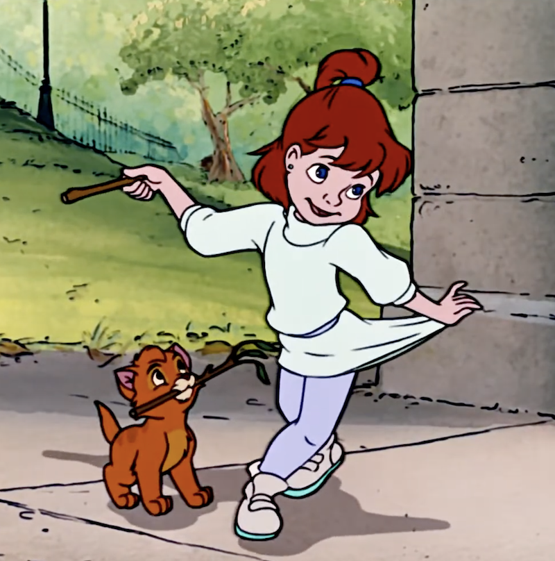 Oliver and Company is an under-rated Disney movie that is defiantly has its cute moments especially since Oliver is an adorable kitten who gets accidentally adopted by Jenny. Jenny is daughter is rich Upper East Side family and as such her white outfit is rather cliche for child. It’s a white turtle-neck dress with some periwinkle legging and matching belt with sneakers. The ever-so slighty puffed three-quarter sleever elvated this look ever so slight out of being boring. Very wearable