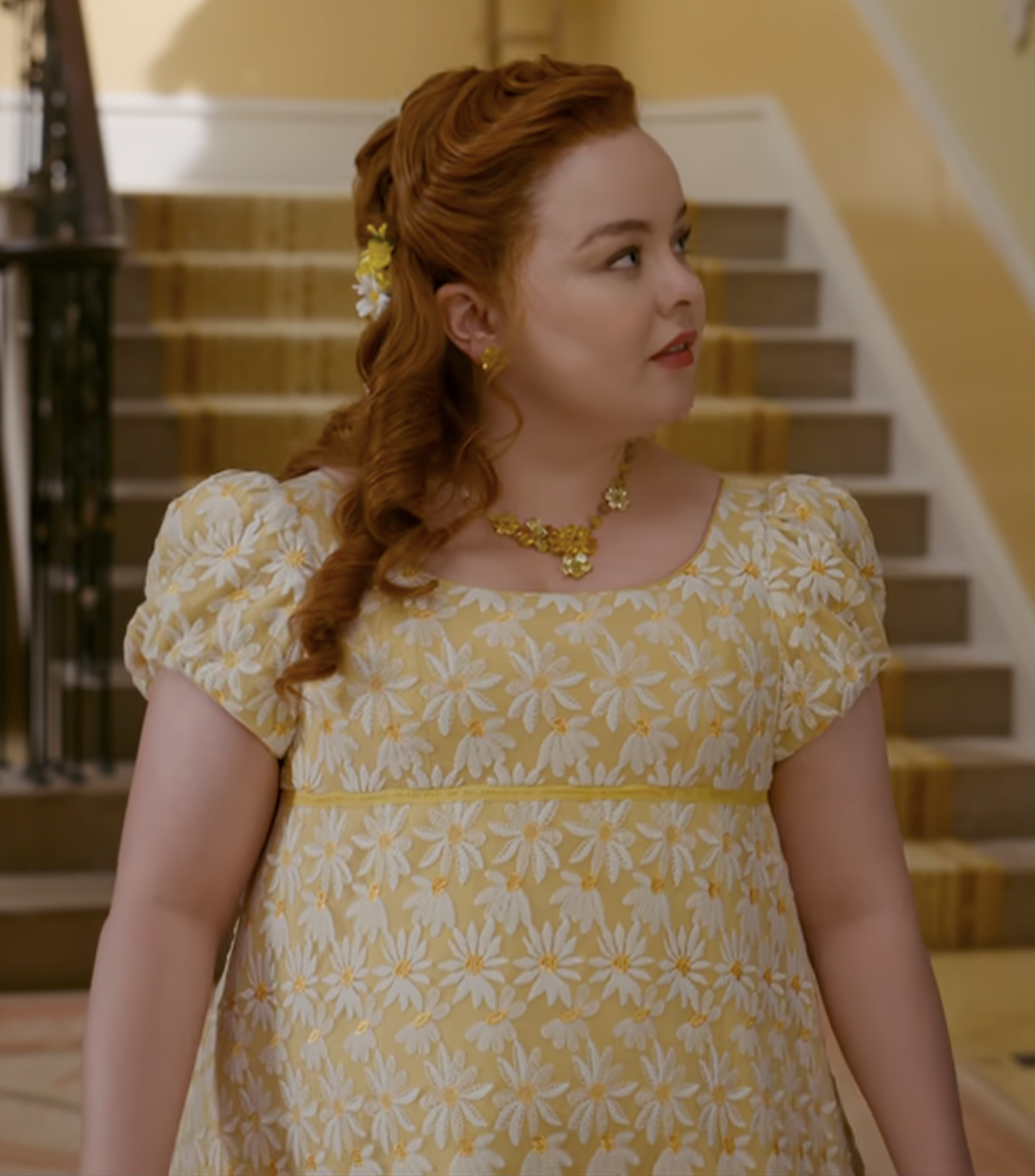 One of the favored activities in the Ton is promenading, which is walking leisurely in public. While promenading with rest of Bridgerton, Penelope wears a lovely yellow and pink patterned dress. It has no embellishments which lets the pretty pattern shine. It’s rather chic and playful with the large-scale design on the fabric.