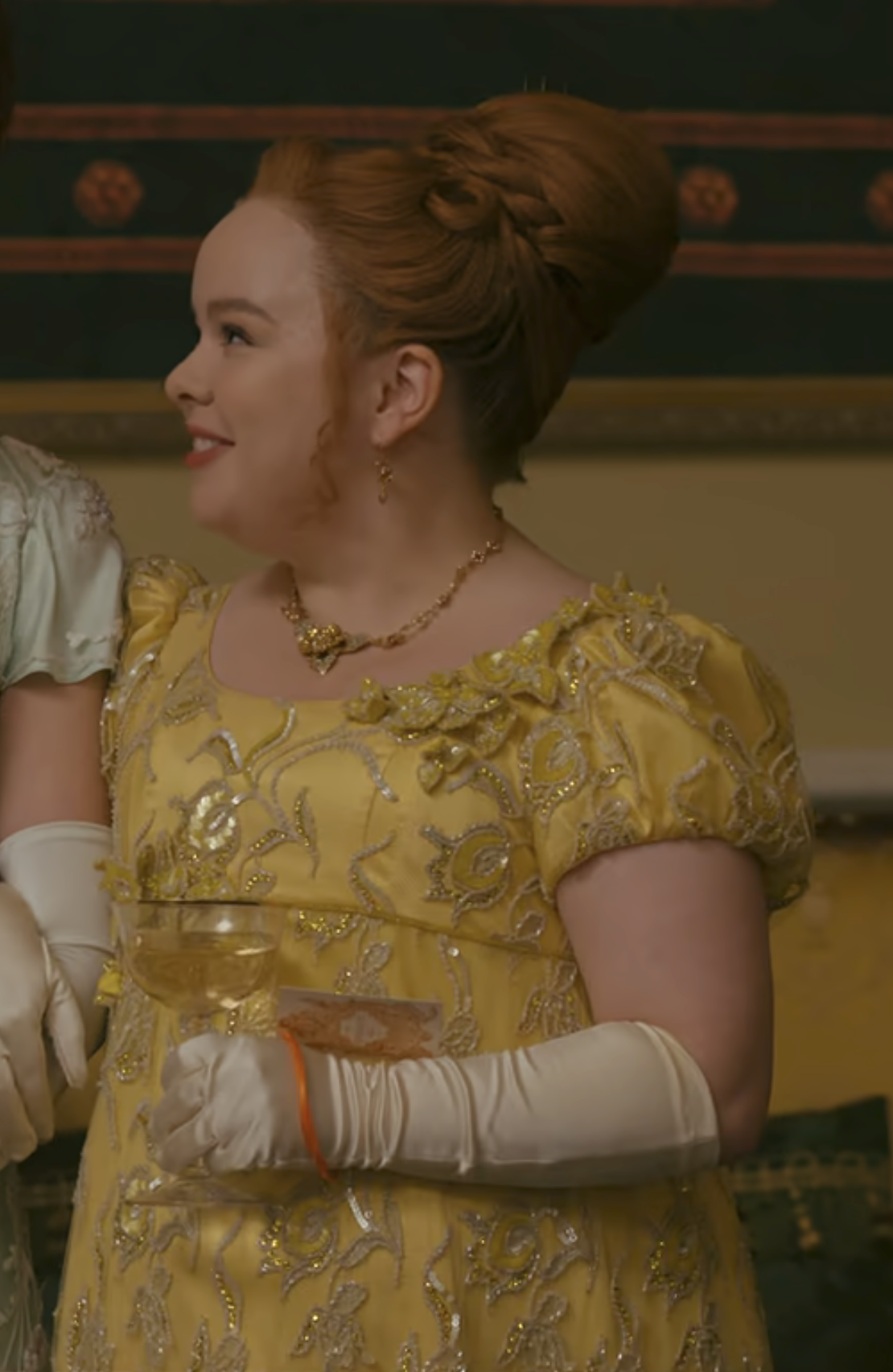 Like the other members of the Ton, Penelope and her family attend the failed wedding of Anthony Bridgerton and Edwina Sharma, hosted by the Queen herself. Penelope’s outfit is a blend of her family’s style with her burgeoning sense of taste. The soft pastel yellow dress with a sheer white overlay. The bodice is decorated with white beaded flowers with rhinestones at the centers. There are also tiny white beads which diffuse down to just below the waistline.