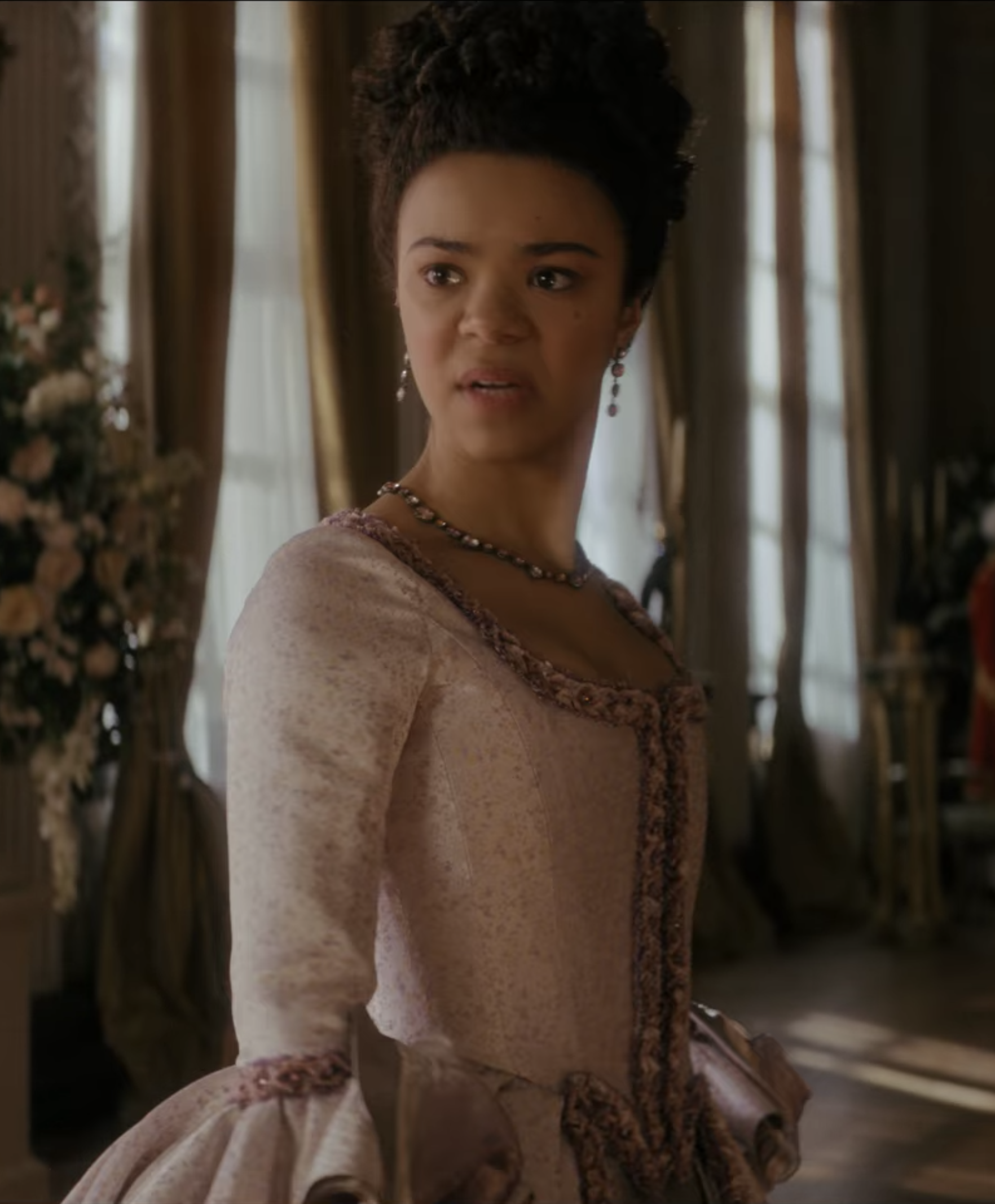 In the first season of Bridgerton, Queen Charlotte is depicted as cold, demanding, calculating, scheming and a gossip. She likes to be in control and enthralled by the Ton and the season’s debutantes. However there are moments in the main series that she shows softness and vulnerability especially when it comes to her husband who suffers from mental illness.