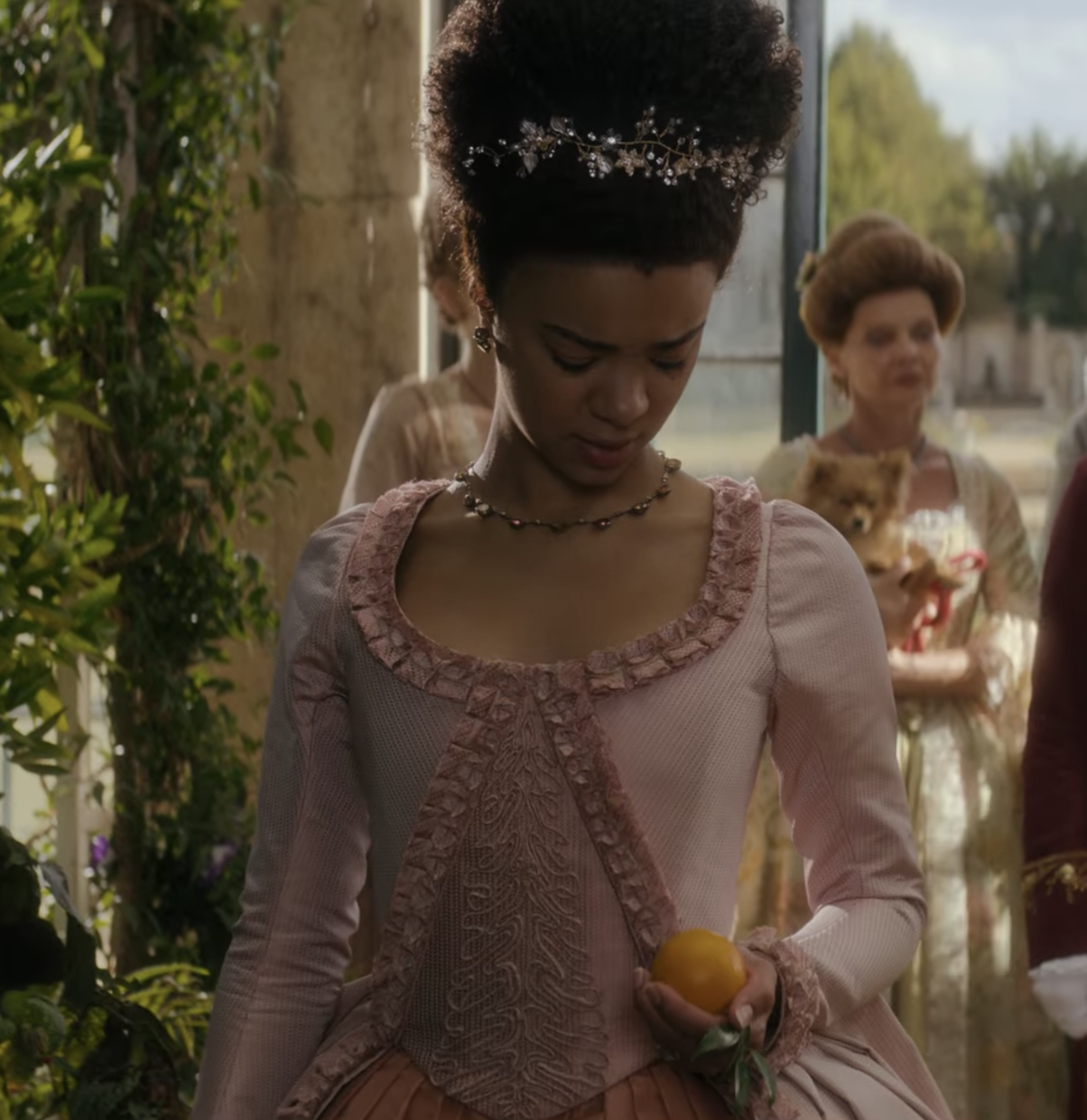 Tired of having her oranges picked for her, Charlotte declares that she will pick her own fruit. As she makes this declaration she wears a lovely long sleeved monochromatic gown in shades of muted pink.