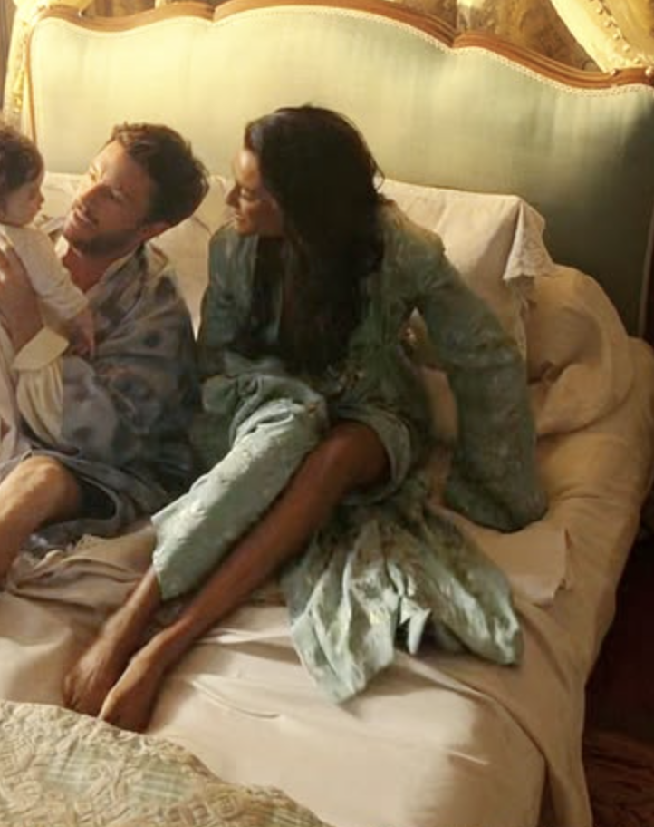 Kate and Anthony return to Aubrey Hall from India at the beginning of episode six, chilling in bed with their baby boy Edmund. As they relax Kate wears a blue floral dressing gown. This dressing gown is slightly muted but it’s more of medium tone therefore it suits her better than a more grayed blue. However the best costume Kate wears is a nightgown that she wears in a behind the scenes images.