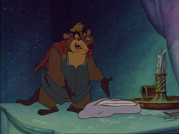 Drosselmeiertells her the story of how he and his nephew, Hans, worked at a castle. After eating the King’s cake, The Mouse queen curses the Princess into being ugly. Drosselmeier learns that only way to cure the Princess’ ugliness is with the Krakatooth nut and some steps backwards. The King declares that one who can cure her will win her hand in marriage. Many try but Hans cracks the nut with his teeth but as he is completing the spell the Mouse Queen changes him in to the Nutcracker doll. As Hans falls, he cause a statue to fall which kills the Mouse Queen as well a ruining Mouse Prince’s tail. The new Mouse King vows revenge for his tail.