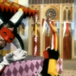 The Final starts with Frollo pronouncing Esmeralda’s sentence then it goes into “song” portion. I use the word song in quotes because the Finale is a melody piece as it uses songs from throughout the show with one exception. So it starts pretty much the same as the movie with Sanctuary playing complete with latin lyrics as Esmerlada starts being burned and Quasimodo saves her and proclaiming sanctuary. Then Phoebus starts railing the people of Paris with the tune of Einmal (Once). Then the scene shifts back to Quasimodo who is defending Notre Dame from Frollo and his minions as he sings the tune of Wie aus Stein (Made of Stone).