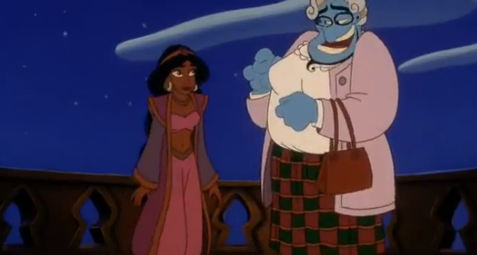 Then we have the Genie. Oh, Genie. They made a big deal that Robin Williams was back doing the voice of the Genie. And while sometimes the jokes were great, most of the time they were just references for like every movie ever especially Disney movies. It was too much, way too much, I mean he referenced himself as Mrs. Doubtfire. It was grating and not funny and I didn’t like it.